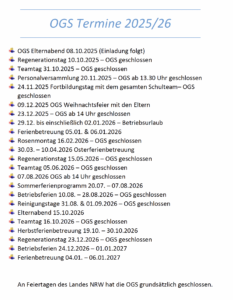 Wenn Sie sich für einen OGS Platz interessieren, füllen Sie bitte bei der Schulanmeldung den OGS Antrag aus. Alternativ haben wir zum Download den OGS Antrag hinterlegt. Dieser Antrag ist noch unverbindlich und dient auch als Dokument für die Warteliste.